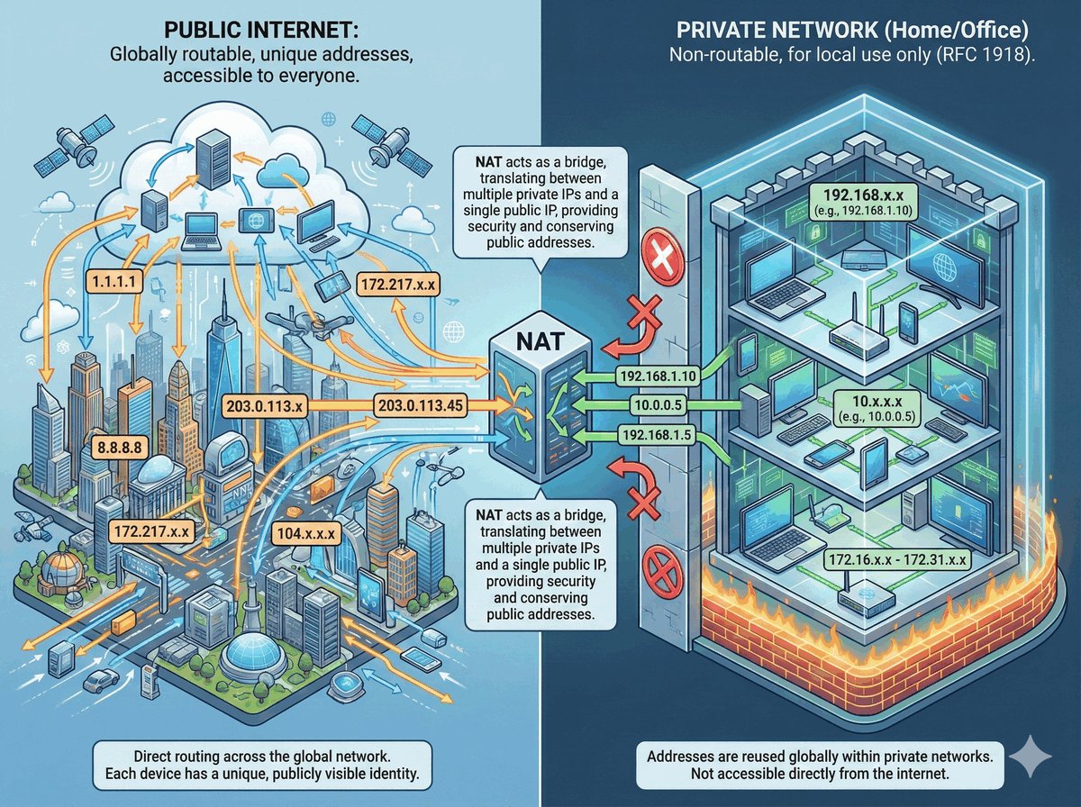 W świecie IPv4 adresy dzielimy na dwie główne grupy. Adresy publiczne są unikalne na skalę światową — każdy serwer w Internecie musi mieć taki adres, aby był widoczny z zewnątrz. Ich pula jest ograniczona i kosztowna, dlatego są one przydzielane przez centralne organizacje (jak IANA).