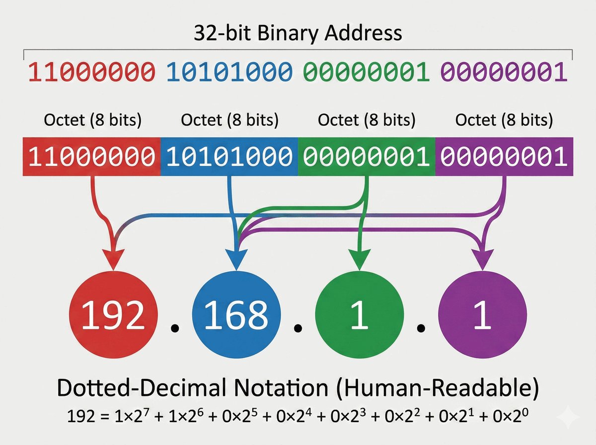 Komputer operuje wyłącznie na zerach i jedynkach, więc dla niego adres IP to ciąg 32 bitów (np. 11000000 10101000...). Dla człowieka taki zapis jest niemożliwy do zapamiętania, dlatego stosujemy wygodną notację dziesiętną z kropkami (dotted-decimal notation).