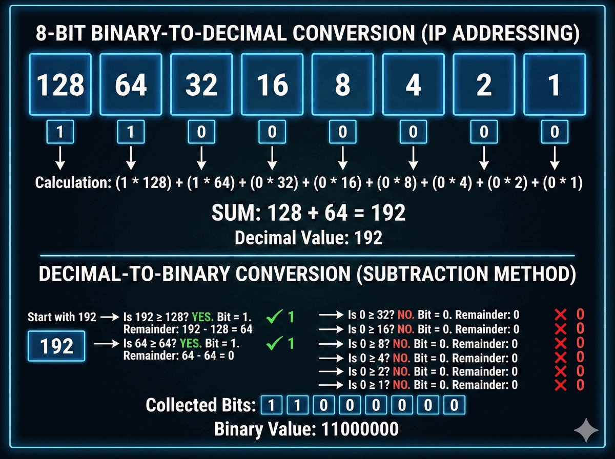 Praca sieciowca wymaga sprawnej zamiany liczb z systemu dziesiętnego na binarny i odwrotnie. Każda z ośmiu pozycji w oktecie ma swoją stałą wartość (wagę), będącą kolejną potęgą liczby 2: od 128 na początku do 1 na końcu. Jeśli na danej pozycji jest jedynka — dodajemy jej wagę do sumy; jeśli zero — pomijamy.