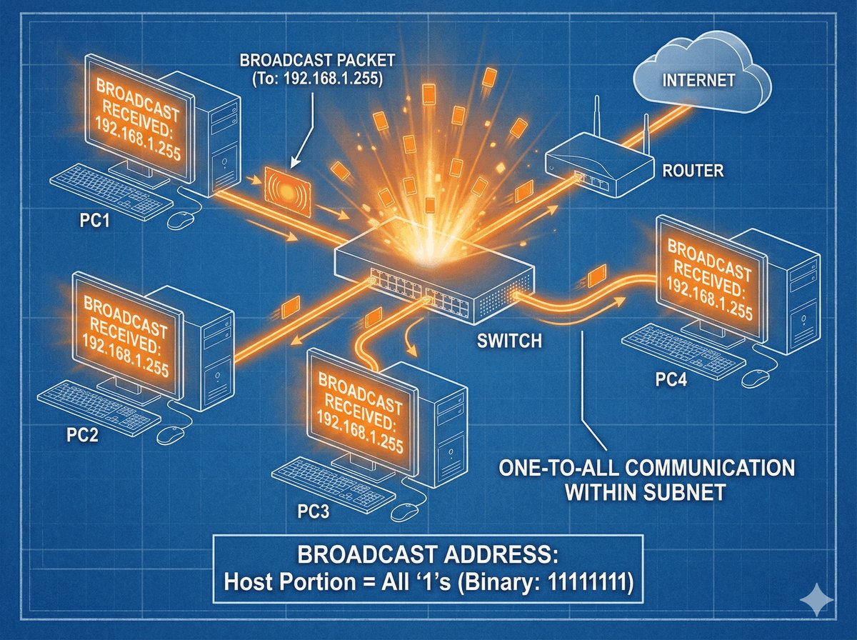 Jeśli komputer wyśle pakiet na ten specjalny adres, każde urządzenie w tej podsieci musi go odebrać i przeanalizować. Jest to niezbędne do działania wielu podstawowych usług, takich jak automatyczne pobieranie adresu IP (DHCP) czy znajdowanie sąsiadów przez ARP. Nadmierna liczba takich komunikatów (tzw. „broadcast storm") może jednak zapchać sieć, dlatego jednym z zadań inżyniera jest dzielenie dużych sieci na mniejsze segmenty broadcastowe.