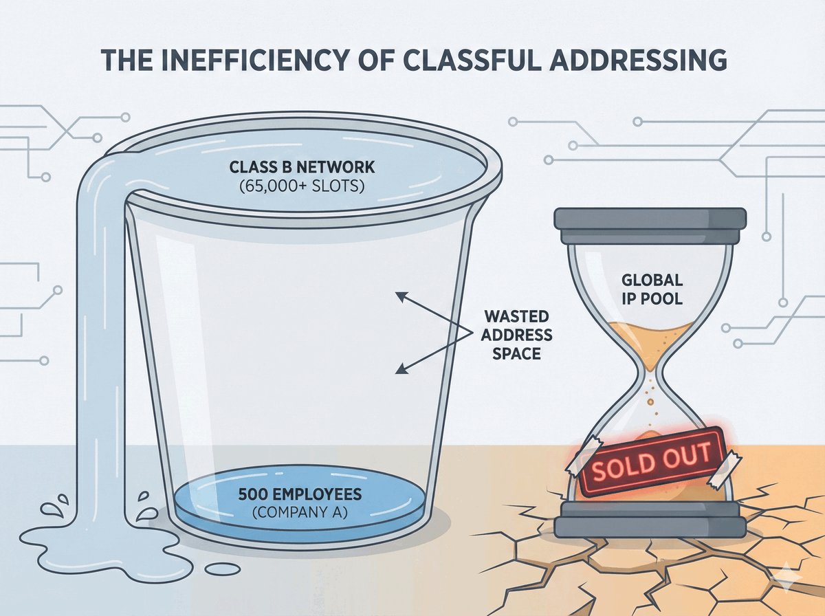 Sztywne ramy systemu klasowego doprowadziły do paradoksalnej sytuacji: z jednej strony ogromna rzesza instytucji nie miała swoich adresów, a z drugiej — miliony numerów należały do organizacji, które nigdy ich nie wykorzystały. Przepaść między 254 (klasa C) a 65 534 (klasa B) adresami była zbyt duża dla dynamicznie rozwijającego się rynku IT.