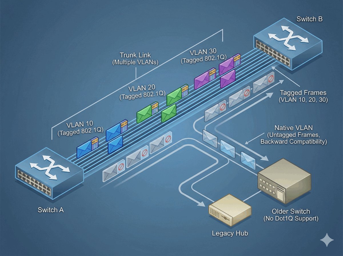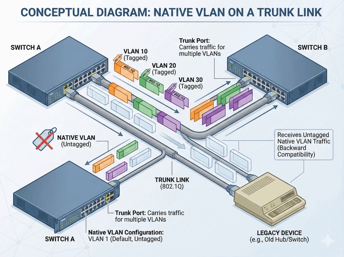 Native VLAN (natywny VLAN) to specjalna sieć skonfigurowana na porcie typu trunk. Cechą charakterystyczną jest to, że ramki należące do tego konkretnego VLANu nie są znakowane dodatkowym tagiem 802.1Q podczas przesyłania przez łącze. Pozwala to na komunikację z urządzeniami, które „nie rozumieją" tagowania, takimi jak stare koncentratory czy proste przełączniki domowe.