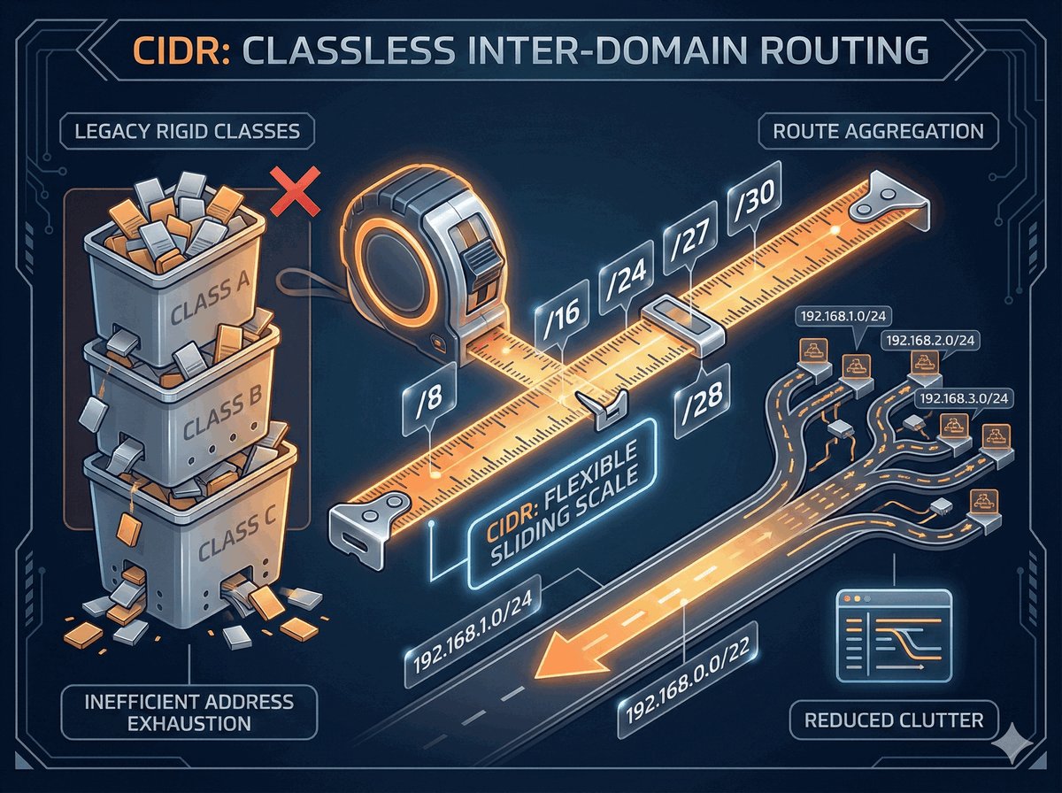 Rozwiązaniem problemów klasowości stał się CIDR (Classless Inter-Domain Routing). To podejście porzuciło narzucone z góry maski na rzecz prefiksów — teraz administrator może uciąć sieć w dowolnym bicie. Zamiast pisać długie 255.255.255.0, używamy krótkiego zapisu z ukośnikiem, np. /24.