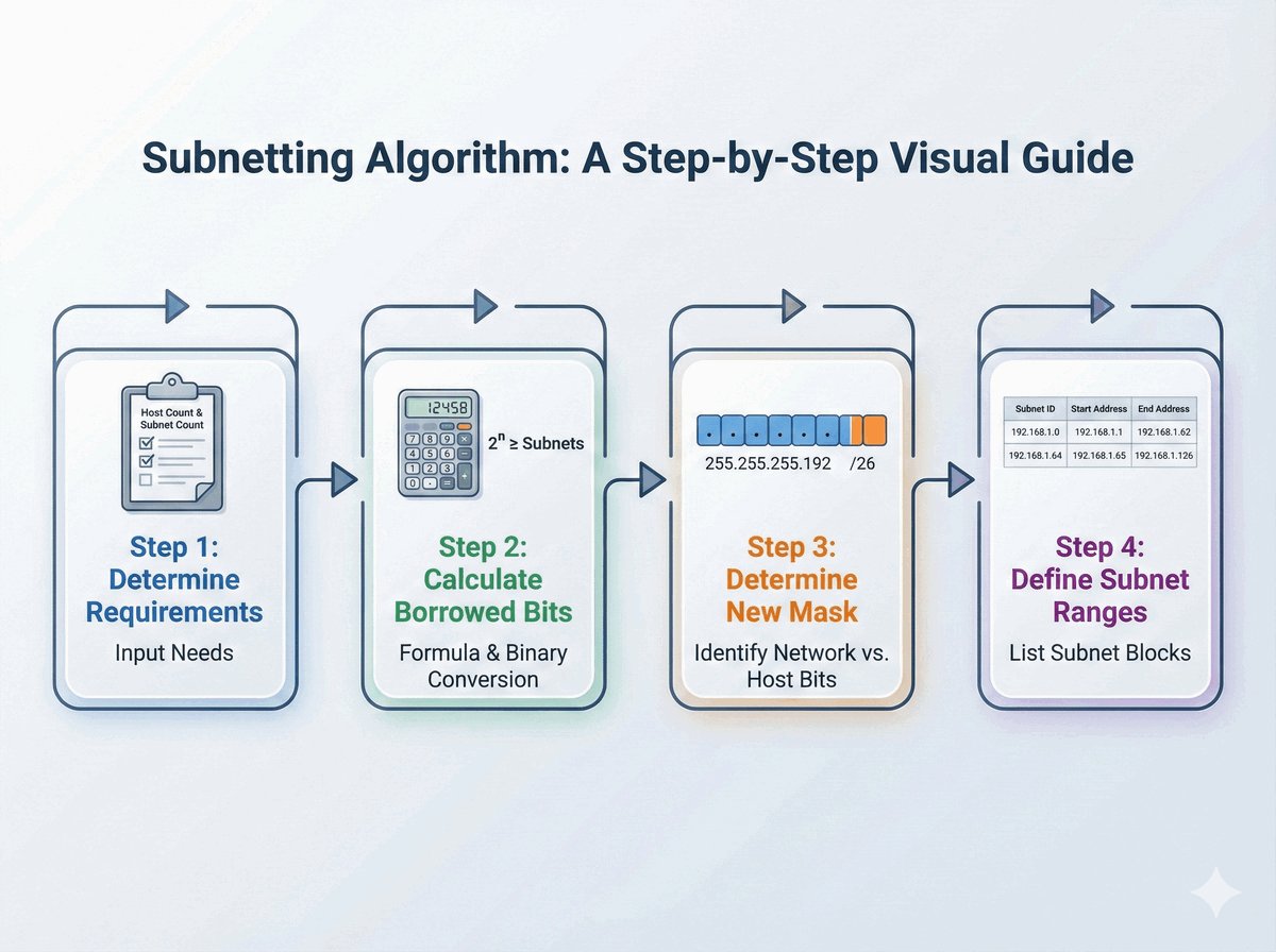 Aby skutecznie przeprowadzić podział, należy postępować według sprawdzonego algorytmu. Najpierw liczymy, ilu hostów potrzebujemy w największym segmencie. Musimy do tej liczby zawsze dodać 2 (na adres sieci i broadcast) oraz często zapas na przyszłość. Szukamy najbliższej, większej potęgi liczby 2, która pokryje to zapotrzebowanie.