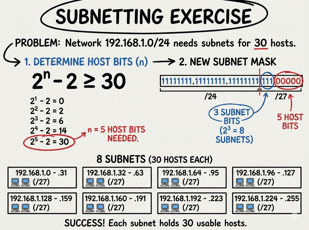 Zadanie: Podziel sieć 192.168.1.0/24 na segmenty po 30 hostów. Aby pomieścić 30 hostów + 2 adresy specjalne, potrzebujemy 32 adresów. 32 to 2 do potęgi 5, zatem musimy zarezerwować 5 bitów na hosty. Pozostałe 27 bitów (32-5) stanowi naszą nową maskę: /27 (czyli 255.255.255.224).