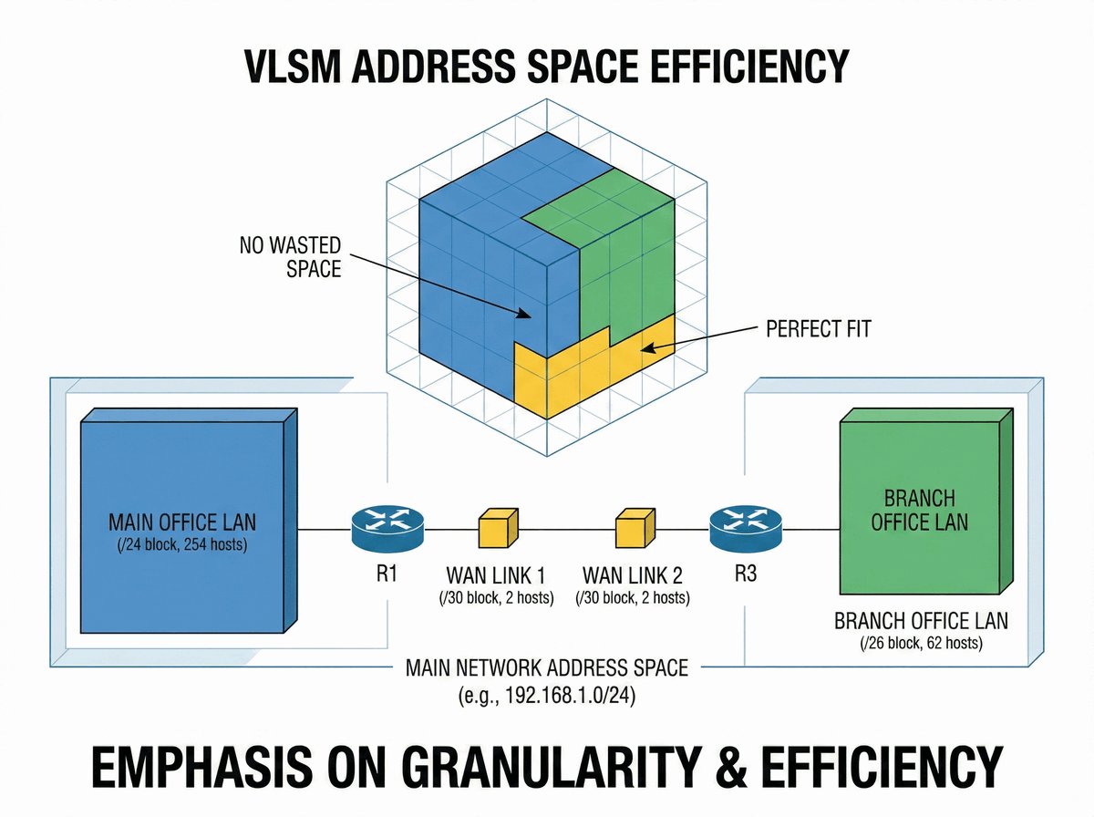 Dzięki VLSM możemy precyzyjnie przydzielić sieć /25 (126 hostów) dla dużego biura i sieć /30 (tylko 2 hosty) dla kabla łączącego dwa routery. To najwyższy stopień wtajemniczenia w zarządzaniu adresami, pozwalający na niemal 100% wykorzystanie dostępnej puli numerów IP.