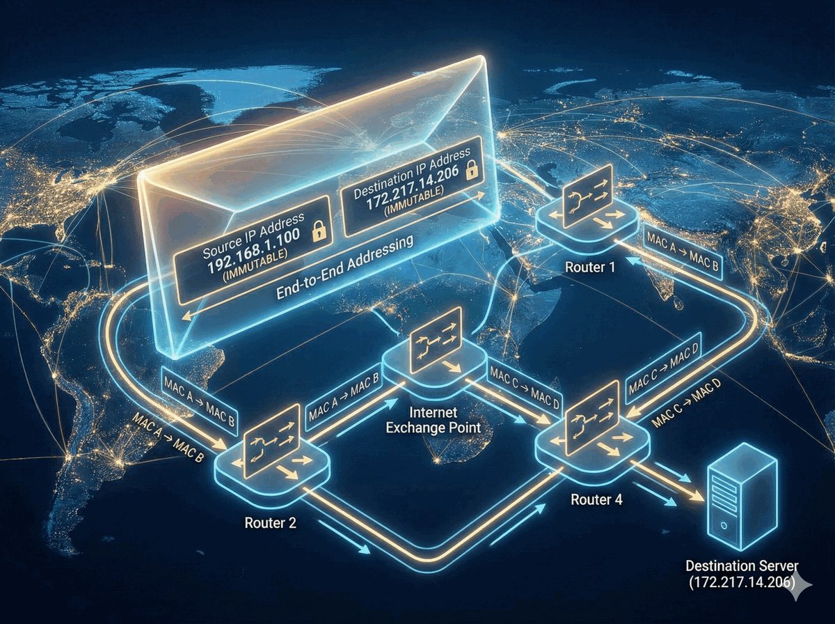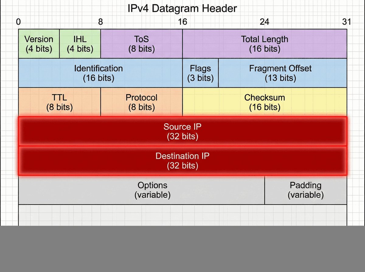 Najważniejsze 64 bity w nagłówku IP to adresy: skąd (źródło) i dokąd (cel). W przeciwieństwie do adresów MAC, które zmieniają się u każdego napotkanego po drodze routera, adresy IP pozostają stałe przez całą podróż od Twojego telefonu do serwera np. Google.