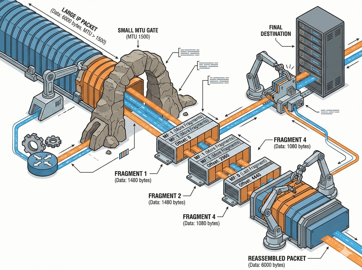 Różne technologie sieciowe mają różną „pojemność wagonika", czyli parametr MTU (Maximum Transmission Unit). Typowo dla Ethernetu jest to 1500 bajtów. Jeśli router musi przesłać większy pakiet do sieci o mniejszym MTU, musi go „pofragmentować" na mniejsze kawałki.