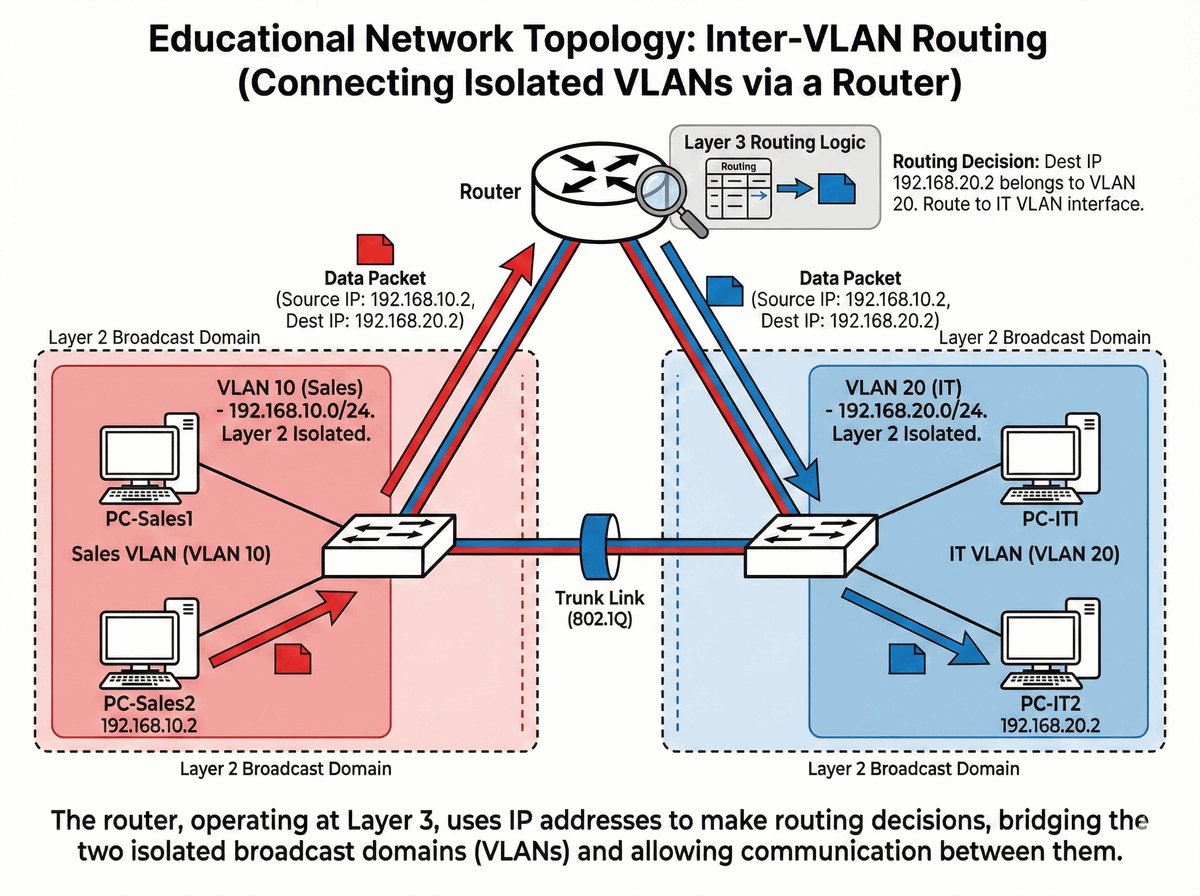 Aby umożliwić wymianę danych między takimi segmentami, niezbędne jest zastosowanie routingu międzysieciowego (Inter-VLAN Routing). Proces ten realizuje router lub przełącznik warstwy 3, który posiada interfejsy w obu sieciach. Router odbiera ruch z jednego segmentu, analizuje adres IP odbiorcy i przesyła go do właściwego, docelowego VLANu, zachowując przy tym pełną kontrolę i bezpieczeństwo przepływu danych.