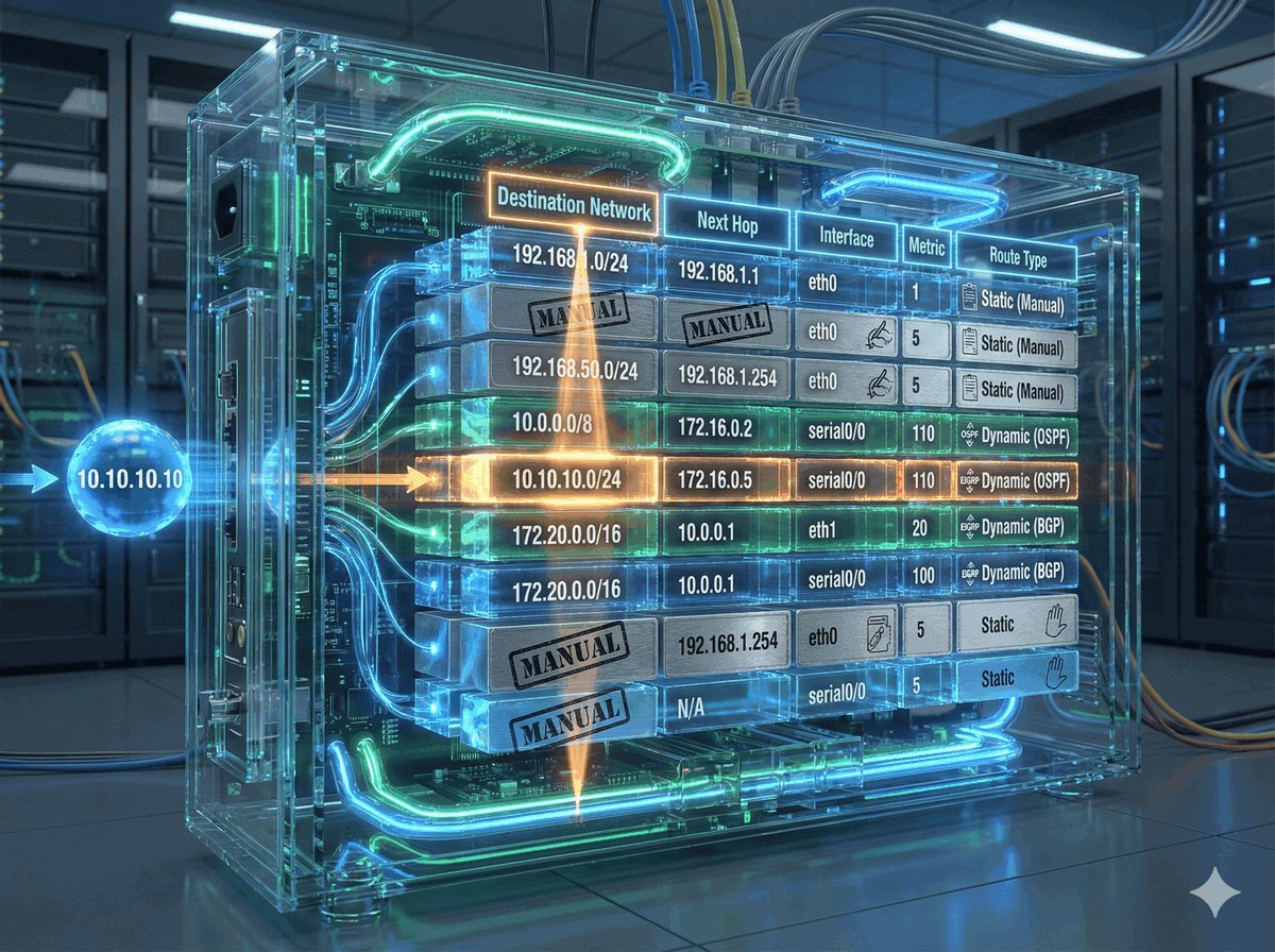 Tablica ta może być uzupełniana przez człowieka (routing statyczny — pewny, ale wymagający pracy) lub przez same routery, które rozmawiają ze sobą przy pomocy protokołów takich jak OSPF (routing dynamiczny). Dobrze utrzymana tablica gwarantuje, że dane zawsze płyną ścieżką o najniższym „koszcie" lub najwyższej wydajności.