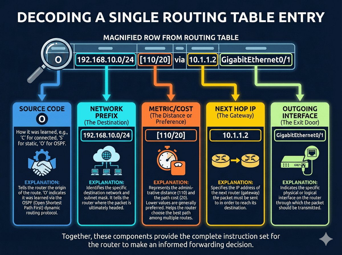 Każdy wpis w tablicy to kompletny przepis na przesyłanie. Składa się z adresu sieci docelowej (cel), adresu „następnego skoku" (Next Hop — czyli adresu kolejnej bramy po drodze) lub nazwy własnego interfejsu wyjściowego. Kluczowym elementem jest również metryka — liczba określająca, jak daleka lub trudna jest ta droga.