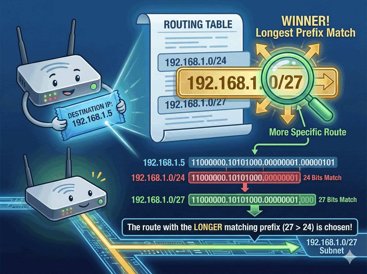 Gdy router ma w tablicy kilka pasujących tras (np. ogólną trasę do miasta i dokładną do konkretnej ulicy), zawsze kieruje się zasadą Longest Prefix Match. Wybierze tę trasę, która ma najdłuższą maskę sieciową, czyli jest najbardziej precyzyjna względem adresu docelowego.
