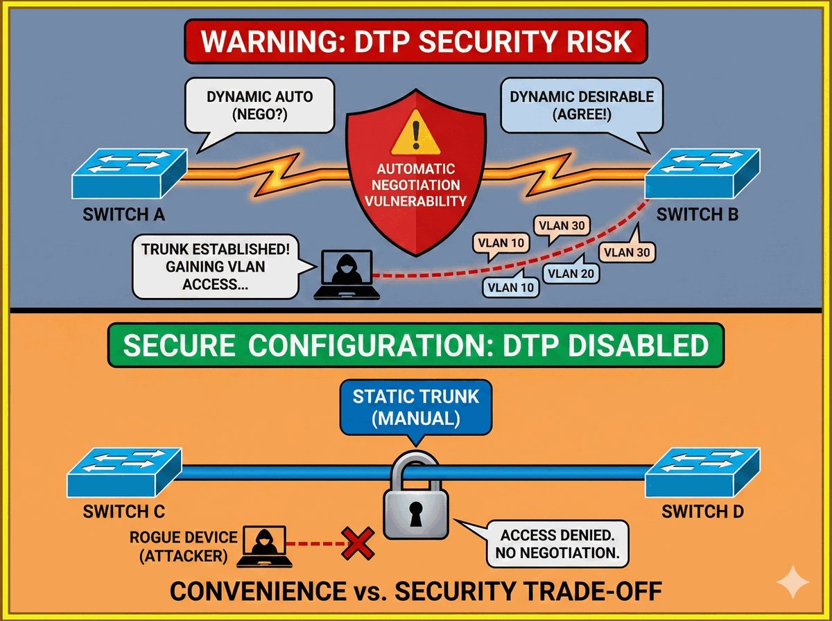 DTP oferuje tryby takie jak 'dynamic auto' (oczekiwanie na propozycję) oraz 'dynamic desirable' (aktywne poszukiwanie połączenia trunk). Choć brzmi to wygodnie, w profesjonalnych sieciach DTP jest zazwyczaj wyłączane. Powodem jest bezpieczeństwo — haker może podłączyć swój laptop i udając przełącznik, wymusić utworzenie łącza trunk, co dałoby mu dostęp do podsłuchiwania ruchu ze wszystkich sieci wirtualnych w firmie.