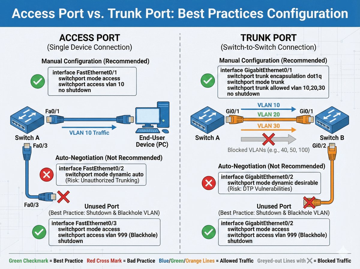 Podczas wdrażania sieci VLAN należy kierować się zasadą ograniczonego zaufania i jawnej konfiguracji. Nigdy nie polegaj na ustawieniach domyślnych — każdy port na przełączniku powinien być ręcznie ustawiony na konkretny tryb pracy: albo 'access' dla urządzeń końcowych, albo 'trunk' dla połączeń między przełącznikami.