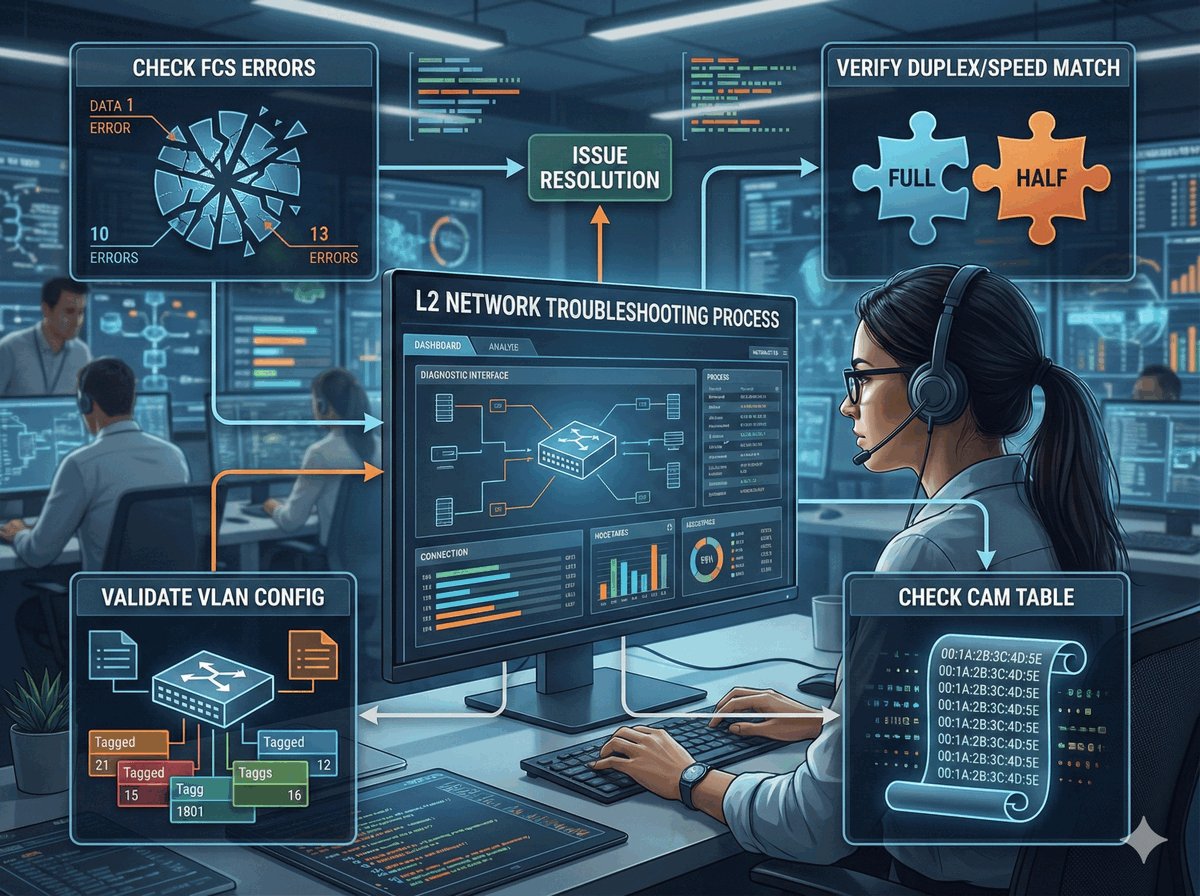 Częstym błędem jest tzw. „duplex mismatch", czyli niezgodność trybu przesyłu danych, co skutkuje ogromną liczbą kolizji i drastycznym spadkiem prędkości. Należy również zawsze upewnić się, że obie strony łącza trunk mają ten sam identyfikator Native VLAN oraz że podsieci IP nie są przypadkowo rozdzielone błędnie skonfigurowanym segmentem VLAN.