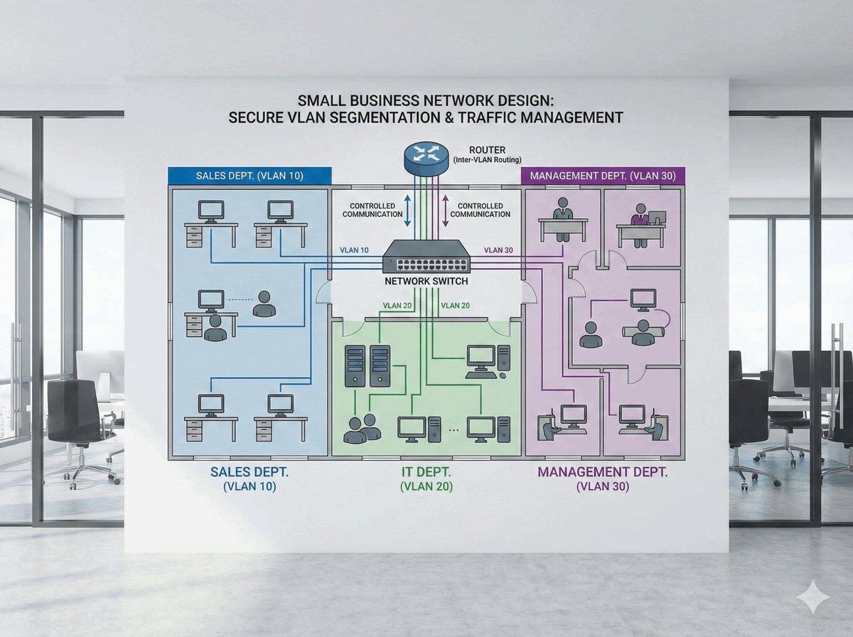 Rozważmy projekt sieci dla firmy z trzema działami: Sprzedażą, Technicznym oraz Finansami. Głównym wymaganiem jest, aby pracownicy różnych działów nie mogli nawzajem przeglądać swoich zasobów sieciowych bez wyraźnej potrzeby biznesowej. W tym celu projektujemy trzy oddzielne sieci wirtualne: VLAN 10 (Sprzedaż), VLAN 20 (Technicy) i VLAN 30 (Finanse).