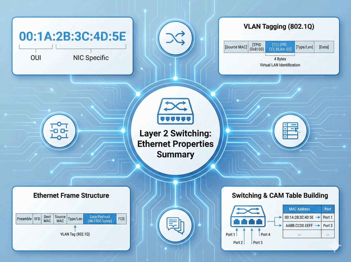 W pierwszej części wykładu poznaliśmy mechanizmy, które sprawiają, że sieć Ethernet działa sprawnie i jest zarządzalna. Dowiedzieliśmy się, że adres MAC jest niezmiennym dowodem tożsamości urządzenia, a ramki danych są przesyłane inteligentnie przez przełączniki dzięki tablicy CAM.
