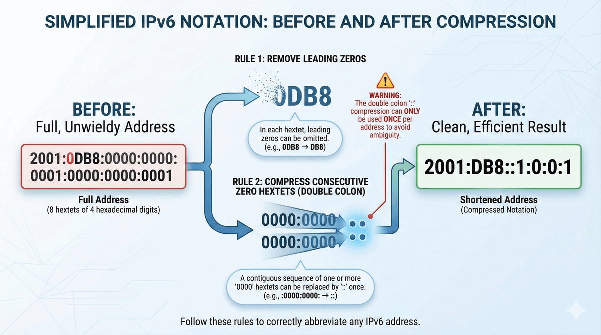 Inżynierowie wiedzieli, że nikt nie chce pisać 32 znaków adresu IP, dlatego wprowadzono dwie zasady skracania. Zasada 1: pomijamy wszystkie wiodące zera w blokach (zamiast 0db8 piszemy db8). Zasada 2: jeden ciąg zer (nawet bardzo długi) możemy zastąpić podwójnym dwukropkiem ::.