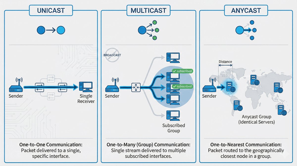 W IPv6 zrezygnowano całkowicie z uciążliwego „rozsyłania do wszystkich" (broadcast). Zamiast tego mamy trzy precyzyjne typy komunikacji. Unicast to klasyczny list do jednej osoby. Multicast to transmisja do grupy zainteresowanych osób (np. tylko dla routerów OSPF).