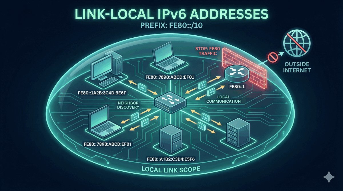 Adresy Link-Local (zaczynające się od fe80::) to specyfika świata IPv6. Każde urządzenie nadaje go sobie samo, bez pytania nikogo o zgodę. Te adresy nigdy nie wychodzą poza dany kabel (segment sieci), ale są niezbędne do „rozmów technicznych" między sąsiadującymi urządzeniami.