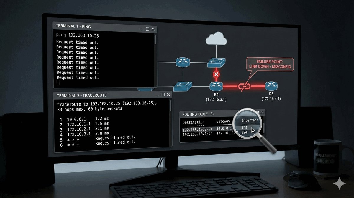 Traceroute to Rentgen sieci — pokazuje nam każdy router po drodze. Jeśli zobaczysz, że pakiety giną np. na czwartym „skoku", wiesz dokładnie, który administrator musi usiąść do pracy. Zawsze sprawdzaj też tablicę routingu poleceniem show ip route — to tam najczęściej kryje się błąd w postaci literówki w masce lub błędnego adresu bramy.