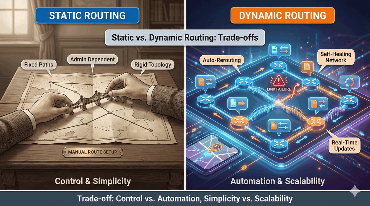 Zasadnicza różnica między routingiem statycznym a dynamicznym to sposób radzenia sobie ze zmianami. W tradycyjnym podejściu (statycznym) to inżynier jest mózgiem sieci — jeśli coś się psuje, musi ręcznie zareagować. W podejściu dynamicznym routery używają specjalnych algorytmów, aby samodzielnie odkrywać topologię i reagować na awarie w ułamku sekundy.
