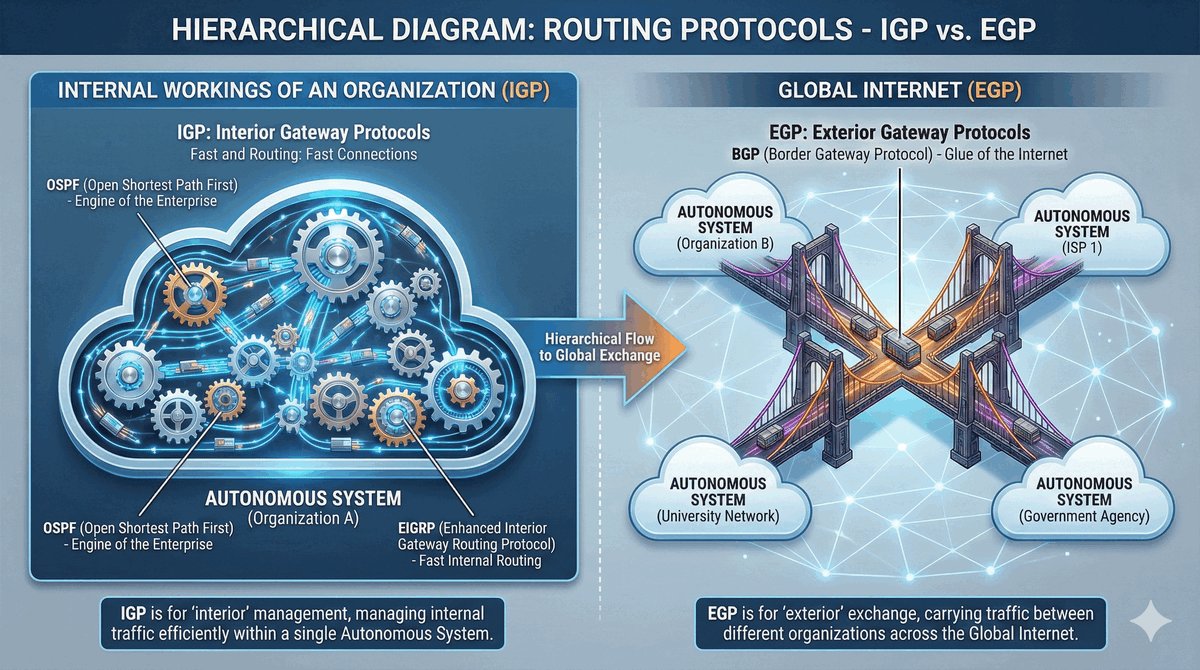 Protokoły routingu dzielimy na dwie ligi. IGP (Interior Gateway Protocols) to protokoły „domowe" — stosujemy je wewnątrz jednej firmy lub kampusu (np. OSPF czy EIGRP). Ich zadaniem jest jak najszybsze znalezienie wolnej drogi od biurka pracownika do serwera w piwnicy.