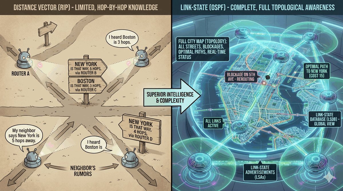 Protokoły IGP mają dwa sposoby działania. Distance Vector (Wektor Odległości, np. RIP) działa na zasadzie plotki: „Sąsiad mi powiedział, że do Google idzie się tędy i jest to 5 klatek stąd". Router wierzy na słowo i przekazuje plotkę dalej. To proste, ale powolne i podatne na pętle.