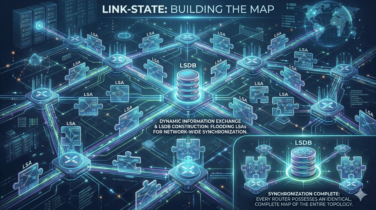 Wszystkie te ogłoszenia trafiają do wspólnej bazy danych LSDB (Link-State Database). Magia polega na tym, że po kilku sekundach każdy router w sieci ma identyczną kopię tej bazy. Od tego momentu każde urządzenie widzi całą sieć tak samo, co eliminuje chaos i sprzeczne informacje o trasach.
