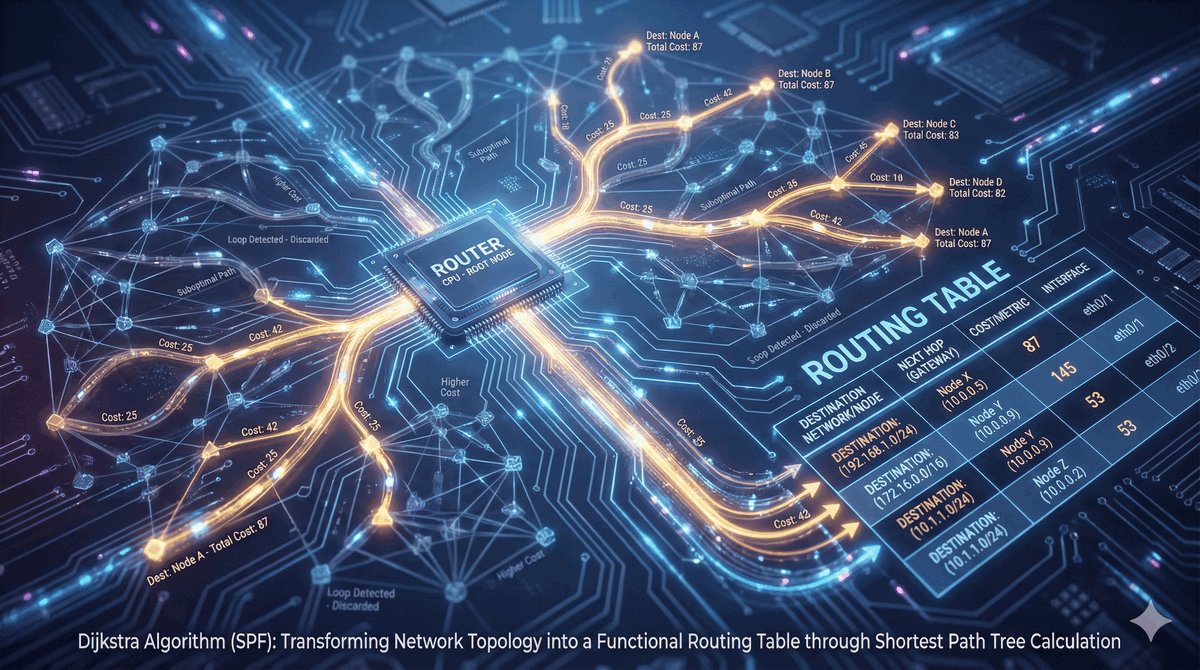 Gdy mapa (LSDB) jest już gotowa, router uruchamia algorytm SPF (Shortest Path First), znany matematykom jako algorytm Dijkstry. Działa on jak nawigacja GPS w samochodzie: bierze mapę wszystkich dróg, nakłada na nie ograniczenia prędkości (koszty łącz) i oblicza najszybszą ścieżkę do każdego celu.