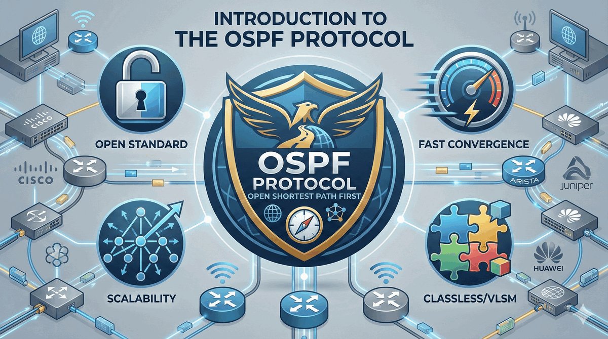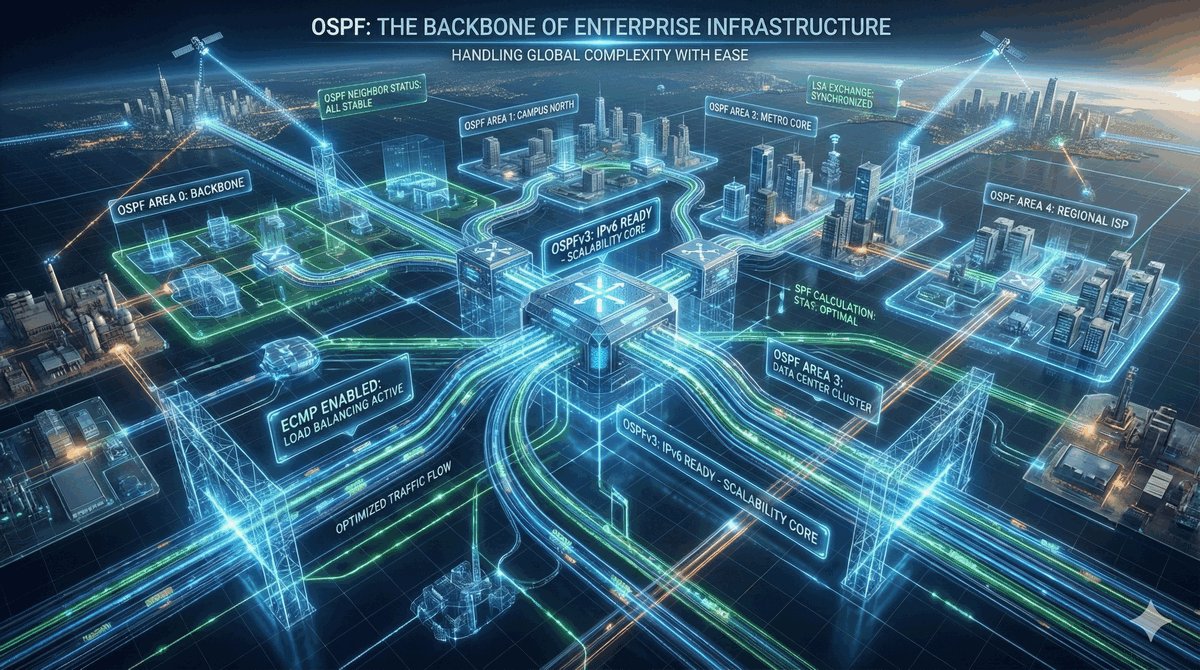 OSPF to „król" współczesnych sieci lokalnych i korporacyjnych. Jego nazwa „Open" oznacza, że nie należy do żadnej firmy — router Cisco może bez problemu rozmawiać przez OSPF z urządzeniem Juniper czy Mikrotik. Jest to protokół tzw. bezklasowy, co oznacza, że świetnie rozumie nowoczesny podział na podsieci (VLSM/CIDR).