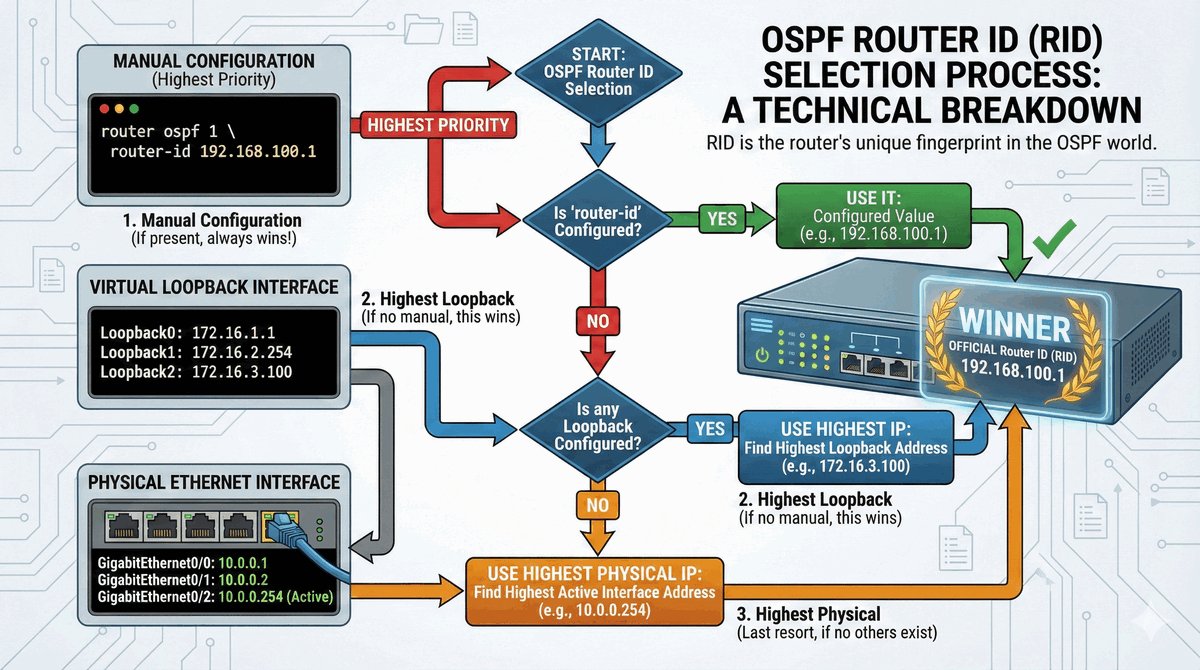Zasady wyboru RID są ściśle określone: router bierze numer ręcznie wpisany przez administratora. Jeśli go nie ma, wybiera najwyższy adres IP ze swoich wirtualnych portów (loopback), a jeśli i tych brakuje — najwyższy adres z fizycznych portów. Dobrą praktyką jest ręczne nadawanie RID, abyśmy zawsze wiedzieli, który router „mówi" w logach systemowych.