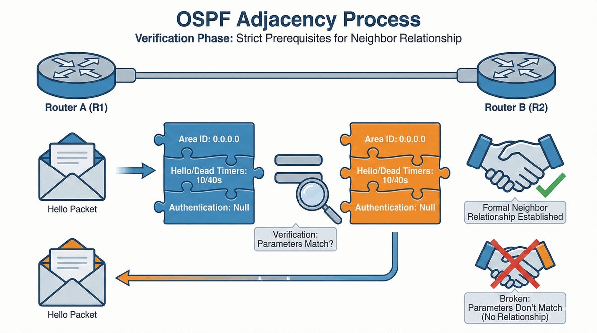 Aby routery zostały sąsiadami (adjacency), muszą się zgadzać w kilku kwestiach: muszą być w tym samym obszarze (area), mieć takie same hasła oraz te same ustawienia czasowe. To mechanizm ochronny — zapobiega on przypadkowemu podłączeniu obcego routera do naszej firmowej struktury i chroni przed błędami w konfiguracji.