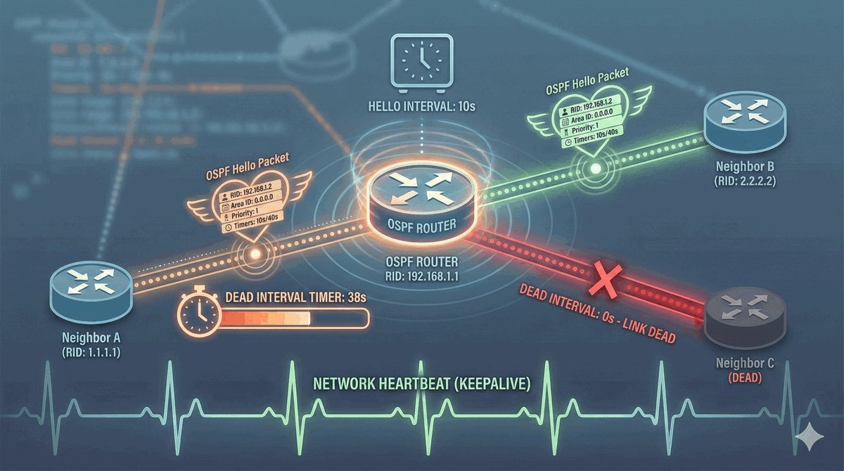 Pakiet Hello pełni dwie funkcje: znajduje nowych sąsiadów oraz pilnuje obecnych. Jeśli router przestanie wysyłać Hello (bo np. ktoś wypiął kabel), sąsiedzi zauważą to po upływie tzw. Dead Interval. Uznają wtedy, że sąsiad „umarł" i natychmiast wyrzucą wszystkie trasy prowadzące przez niego z tablicy routingu.