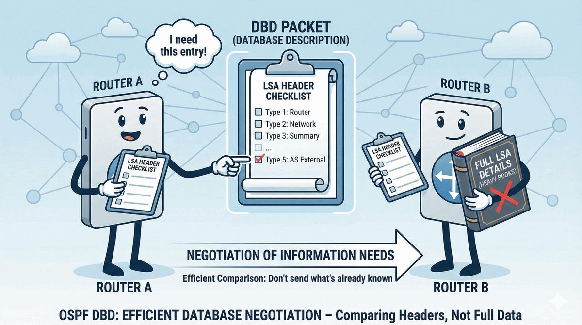 Synchronizacja ogromnych baz danych mogłaby zapchać sieć, dlatego OSPF robi to sprytnie. Zamiast wysyłać od razu tysiące tras, routery przesyłają sobie pakiet DBD (Database Description). To taki „spis treści" ich wiedzy o sieci.