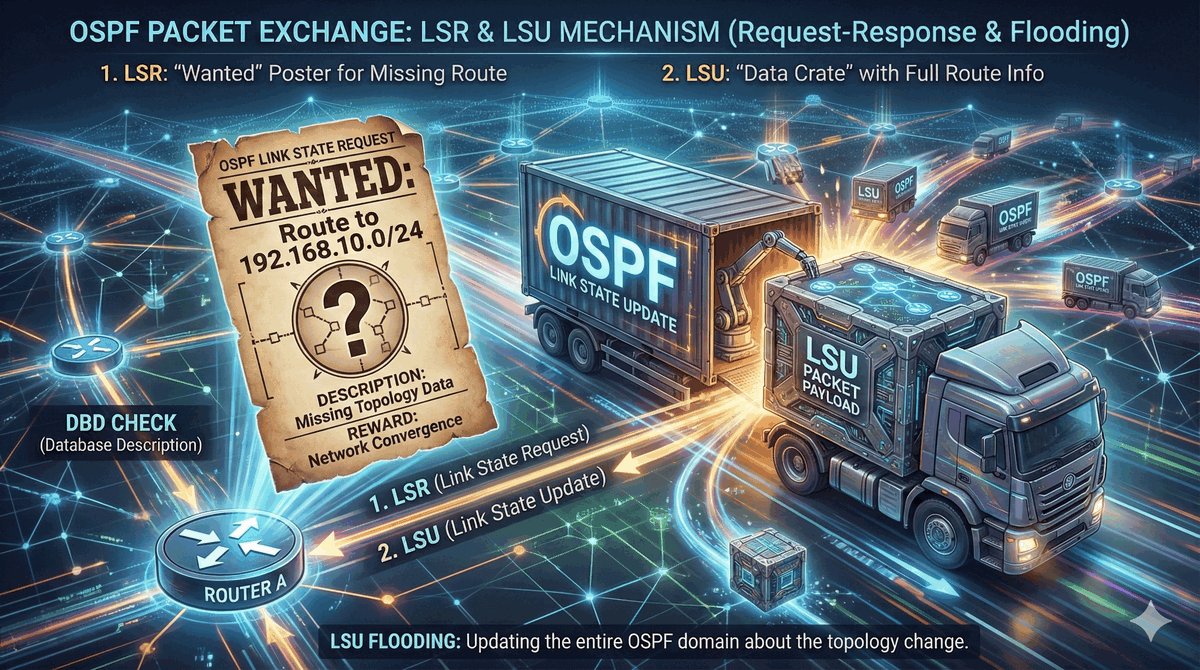 Gdy router wykryje luki w swojej wiedzy po przejrzeniu spisu treści (DBD), wysyła LSR (Link-State Request) — konkretną prośbę o dosłanie brakujących detali. W odpowiedzi otrzymuje LSU (Link-State Update). To właśnie te pakiety niosą w sobie „mięso", czyli faktyczne dane o topologii sieci.
