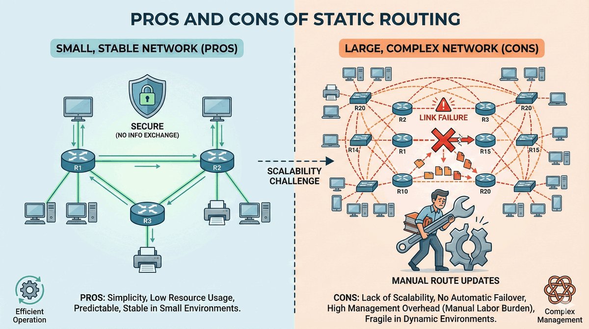 Głównym minusem jest brak odporności na awarie. Jeśli kabel na trasie statycznej zostanie przecięty, router nie będzie wiedział, jak go ominąć, dopóki człowiek nie zmieni konfiguracji. Dlatego trasy statyczne stosujemy tam, gdzie topologia jest prosta, a każda zmiana jest rzadka i planowana z dużym wyprzedzeniem.