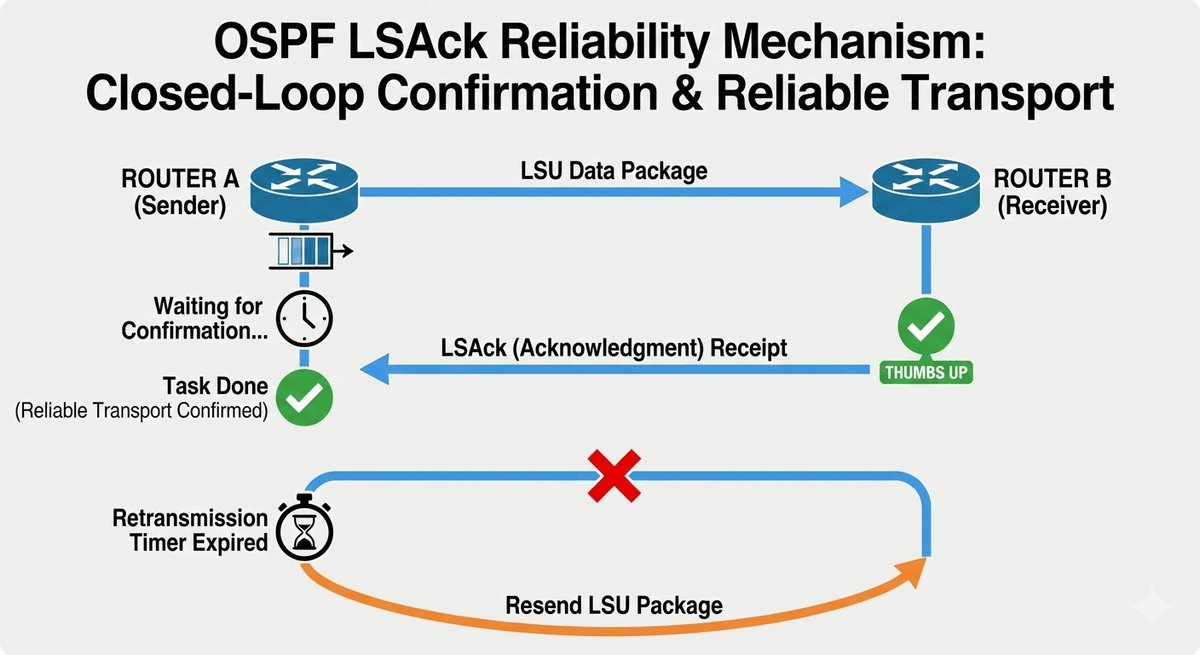 OSPF nie uznaje zasady „wyślij i zapomnij". Każda ważna informacja o topologii (LSU) musi zostać potwierdzona. Służy do tego krótki pakiet LSAck (Link-State Acknowledgment). To jak wysłanie SMS-a z potwierdzeniem: „Dostałem mapę, dziękuję".