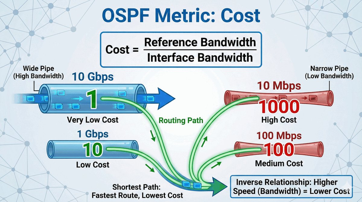 W OSPF nie liczy się liczba routerów po drodze, ale jakość „drogi". Metryką jest Koszt (Cost). Oblicza się go prostym wzorem: dzieli się stałą wartość (referencyjną) przez prędkość łącza. Oznacza to, że im szybszy kabel, tym mniejszy ma koszt, a OSPF zawsze wybiera ścieżkę o najmniejszej sumie kosztów.