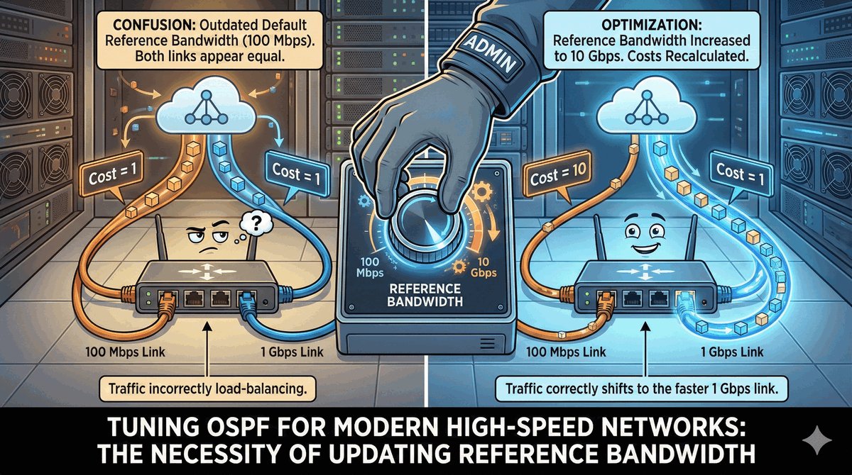 W nowoczesnych sieciach administrator musi koniecznie zmienić tzw. Reference Bandwidth. Podnosząc tę wartość na wszystkich urządzeniach, przywracamy routerom zdolność rozróżniania między „szybkim" a „superszybkim" łączem, co jest kluczowe dla poprawnego kierowania ruchem w nowoczesnych centrach danych.