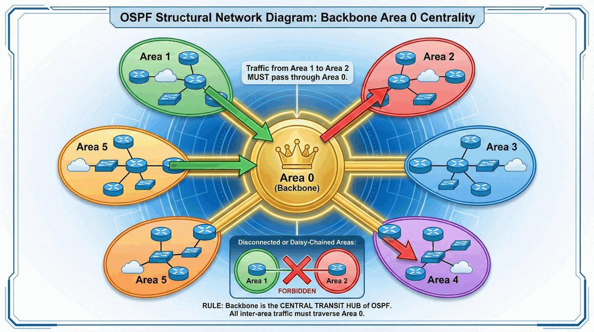 W OSPF istnieje jeden specjalny obszar: Area 0, zwany obszarem szkieletowym (backbone). Jest to obowiązkowe centrum dowodzenia. Każdy inny obszar (np. Area 10, Area 20) musi być fizycznie lub logicznie podłączony bezpośrednio do Area 0.
