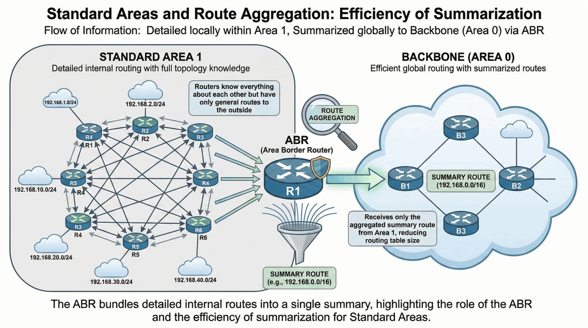 W ogromnych sieciach (tysiące routerów) jedna wspólna mapa byłaby za ciężka do przetworzenia. Dlatego OSPF pozwala na podział sieci na obszary (areas). To jak dzielenie państwa na województwa — każdy router musi znać na pamięć tylko mapę swojego województwa. O reszcie kraju wie tylko tyle, w którą stronę jechać.