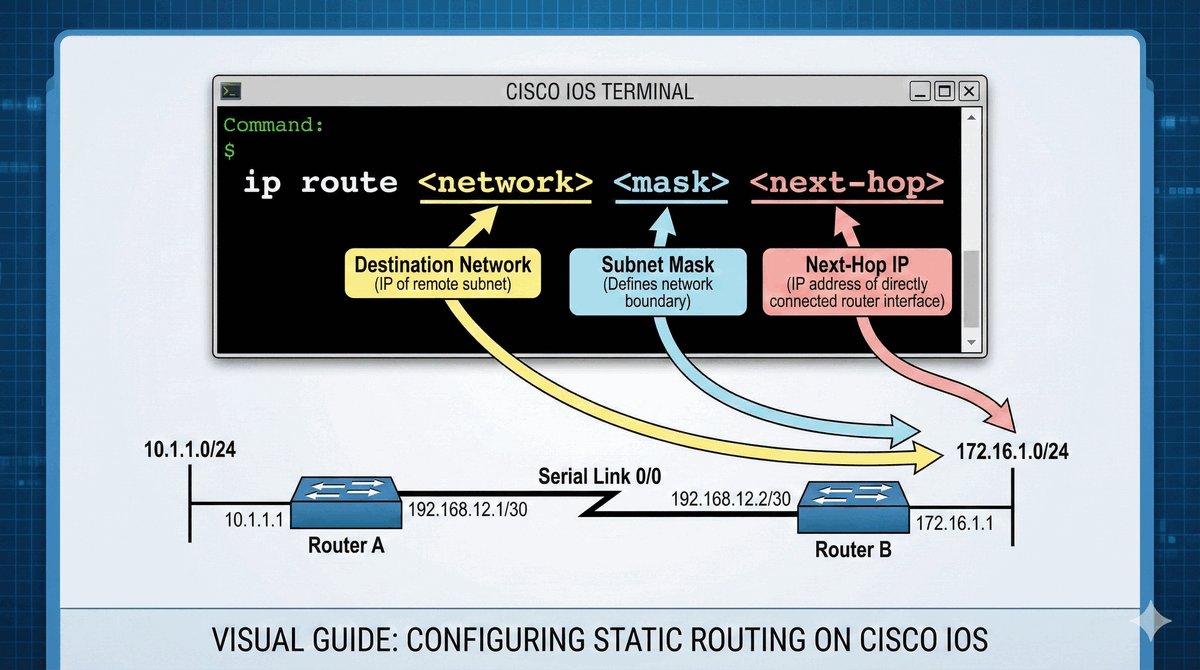 Konfiguracja trasy statycznej (np. w systemach Cisco) sprowadza się do jednej, logicznej linii poleceń. Składnia wygląda następująco: ip route [cel] [maska] [następny-krok].