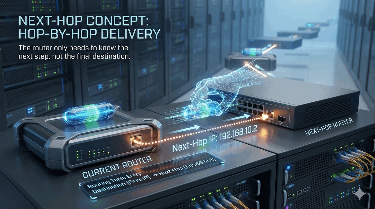 Adres Next-Hop (następny skok) to adres IP routera-sąsiada, który znajduje się o jeden krok bliżej celu. To fundamentalna zasada działania Internetu: żaden router nie musi znać całej drogi od Polski do USA. Wystarczy, że wie, komu następnemu przekazać „pałeczkę".