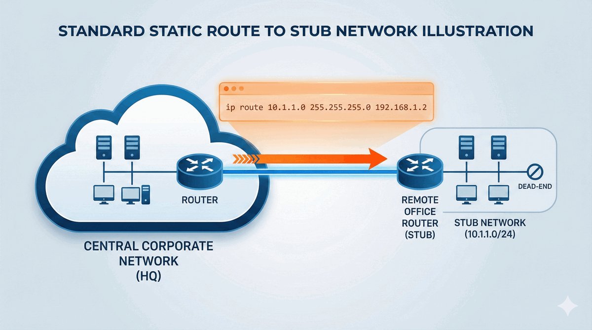 Standardowa trasa statyczna służy do połączenia dwóch konkretnych miejsc. Wyobraźmy sobie, że router w biurze w Łodzi musi wiedzieć, jak wysłać pakiety do serwera w biurze w Warszawie. Administrator wpisuje dokładną trasę tylko dla tego jednego połączenia.