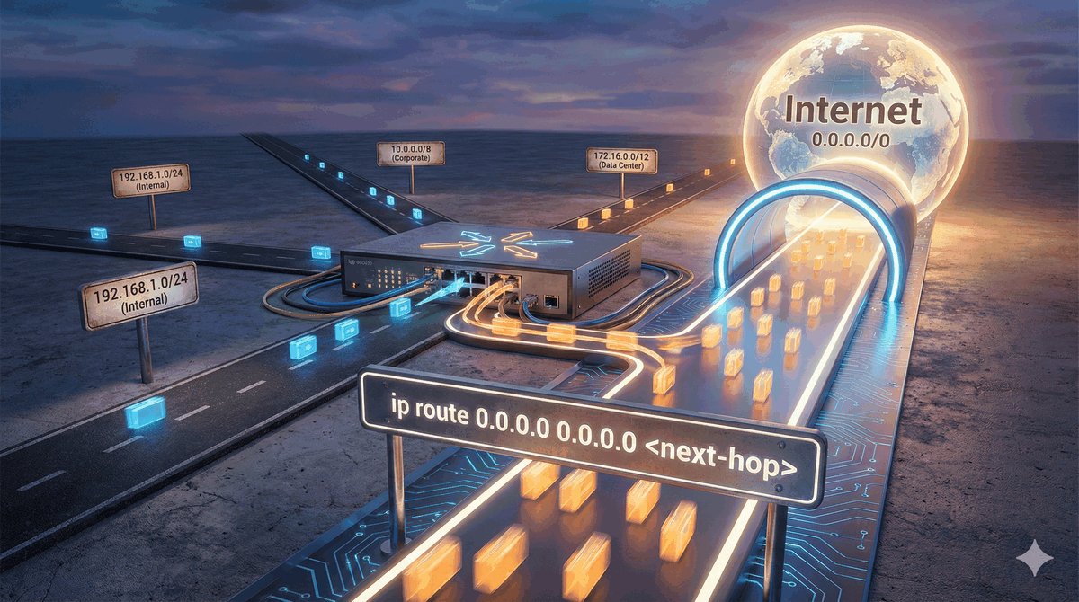 To właśnie trasa domyślna pozwala nam przeglądać Internet. Twój domowy router nie spamięta adresów wszystkich stron na świecie — ma po prostu jeden wpis, który mówi: „wszystko, czego nie znam lokalnie, wysyłaj do mojego dostawcy Internetu (ISP)". Jest to tzw. Gateway of Last Resort (Brama Ostatniej Szansy).