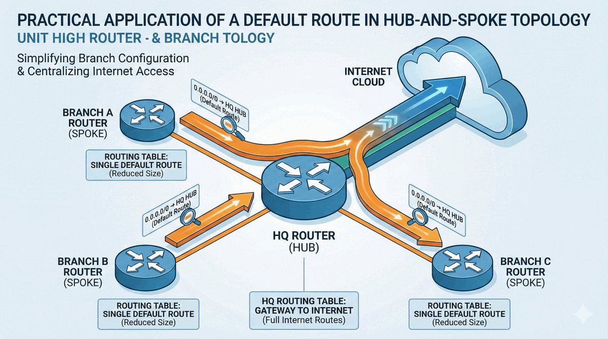 Stosowanie tras domyślnych to potężne uproszczenie w projektowaniu sieci. Zamiast uczyć każdy router w firmie drogi do tysięcy zewnętrznych serwisów, wystarczy, że wszystkie urządzenia będą wysyłać nieznany ruch „w górę" — do głównego routera brzegowego (Edge Router), który jako jedyny ma pełną wiedzę o połączeniach zewnętrznych.