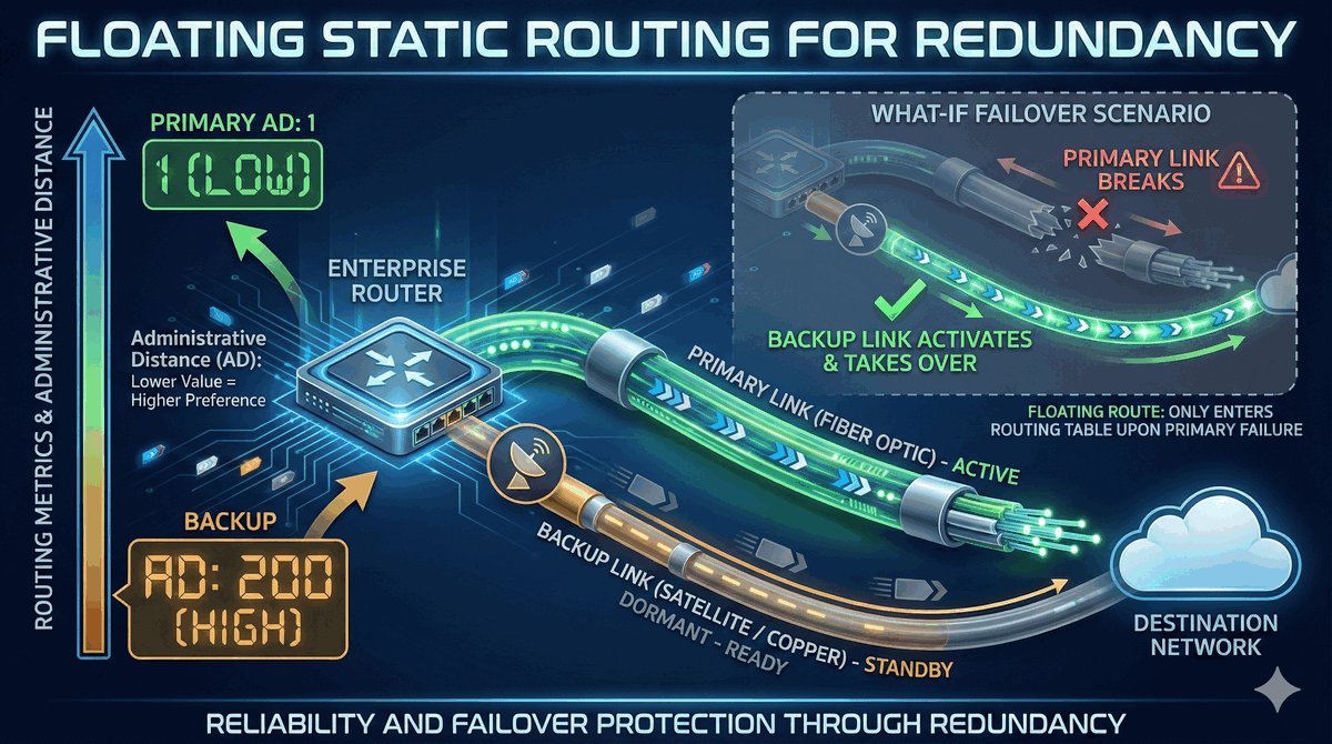 Pływająca trasa statyczna (Floating Static Route) to nasza polisa ubezpieczeniowa na wypadek awarii kabla. Polega na wpisaniu dwóch tras do tego samego celu: jednej przez szybki światłowód, a drugiej przez wolniejsze łącze zapasowe (np. LTE).