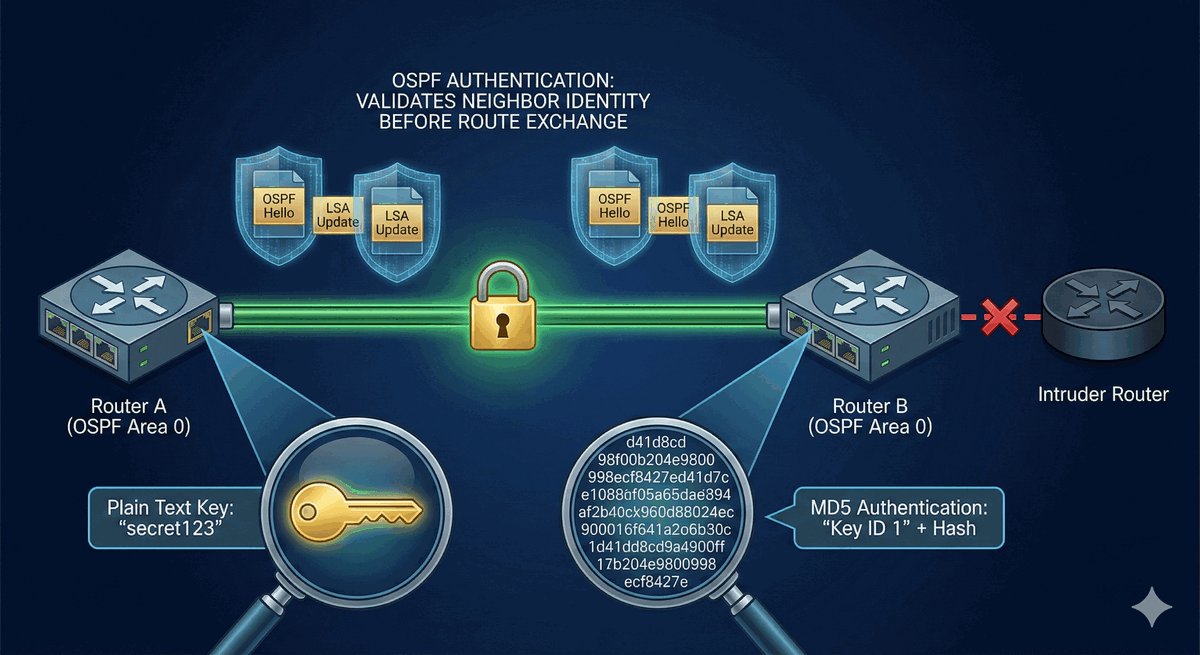 Domyślnie OSPF jest ufny — dołączy do każdego, kto wyśle mu „Hello”. To ogromna dziura w bezpieczeństwie. Haker mógłby podpiąć swój laptop do gniazdka w ścianie i udając router, przejąć kontrolę nad tym, którędy płyną firmowe hasła czy przelewy.