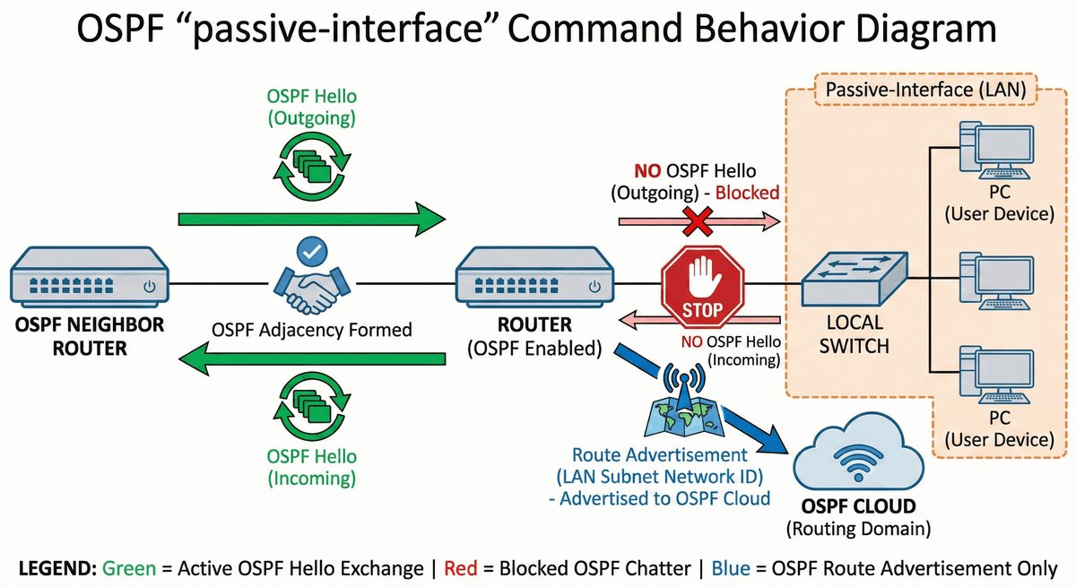 To polecenie mówi routerowi: „Wiem, że na tym interfejsie jest sieć 192.168.1.0 i ogłaszaj ją całemu światu, ale nie wysyłaj TAM żadnych technicznych komunikatów OSPF”. Dzięki temu sieć LAN jest widoczna dla wszystkich, ale nikt wewnątrz niej nie może manipulować pracą naszych routerów.